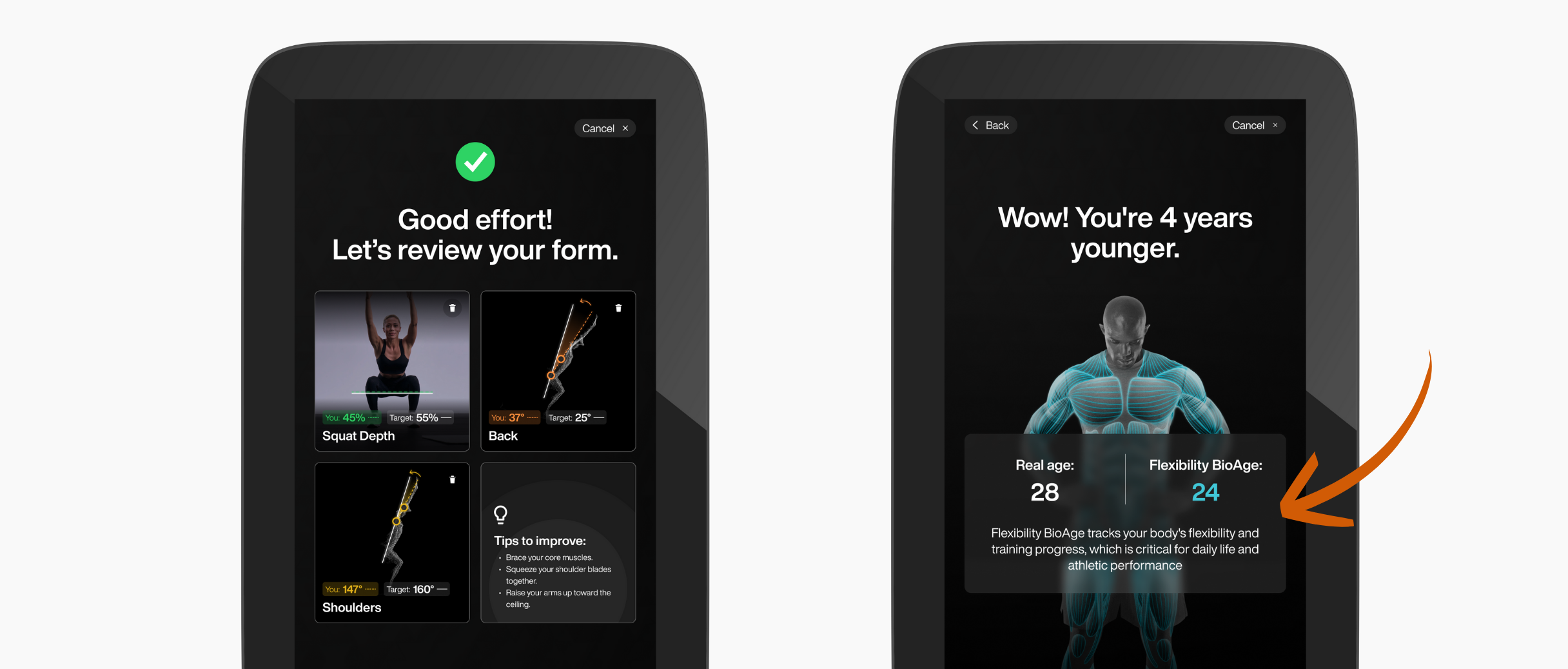 The results of the Squat Flexibility Test are also factored into the Flexibility Age component of BioAge. Members can further refine their Flexibility Age by completing additional flexibility tests. Repeating the Squat Flexibility Test over time stores progress data, visualising improvements in squat depth, shoulder, and back mobility.