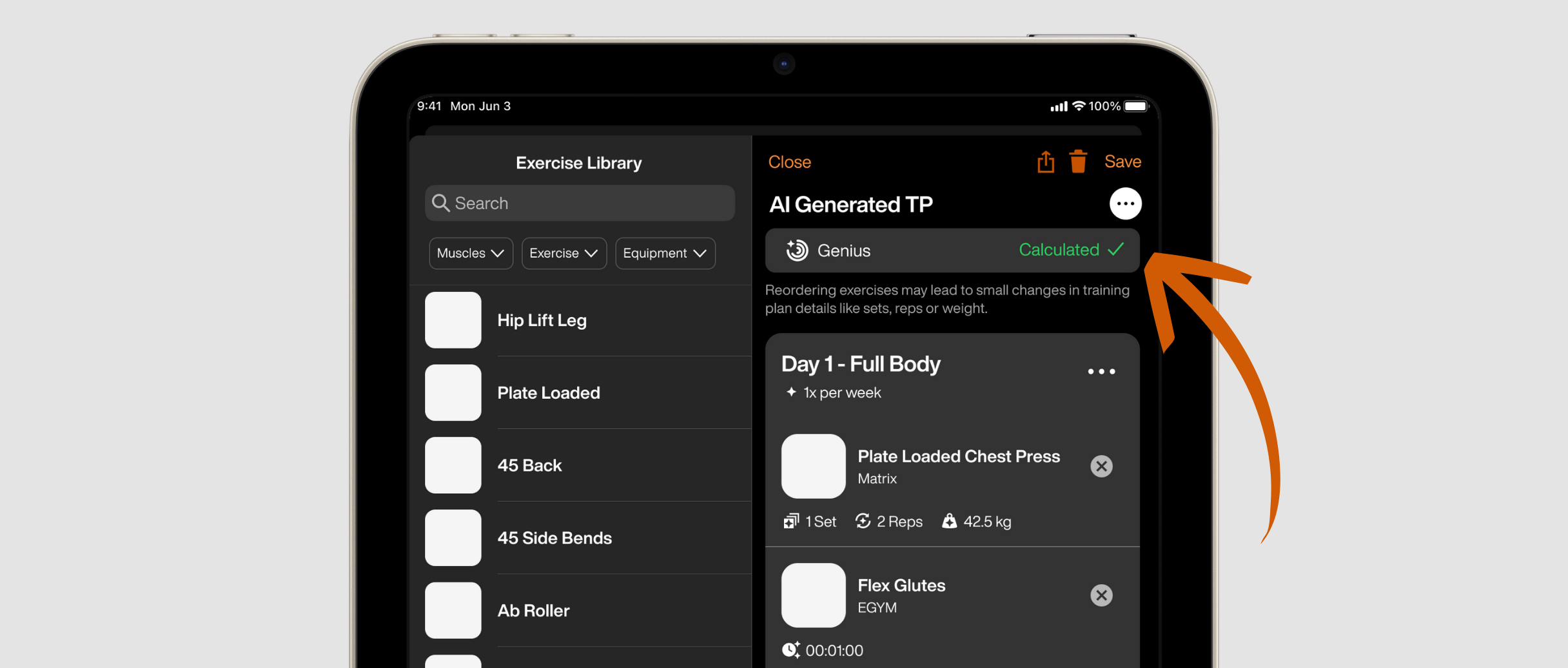 By clicking Recalculate, Genius updates sets, reps, weights, rest times, and machine settings based on the latest changes. The plan stays balanced, effective, and goal-oriented—without overwriting any manually-added trainer prescriptions.