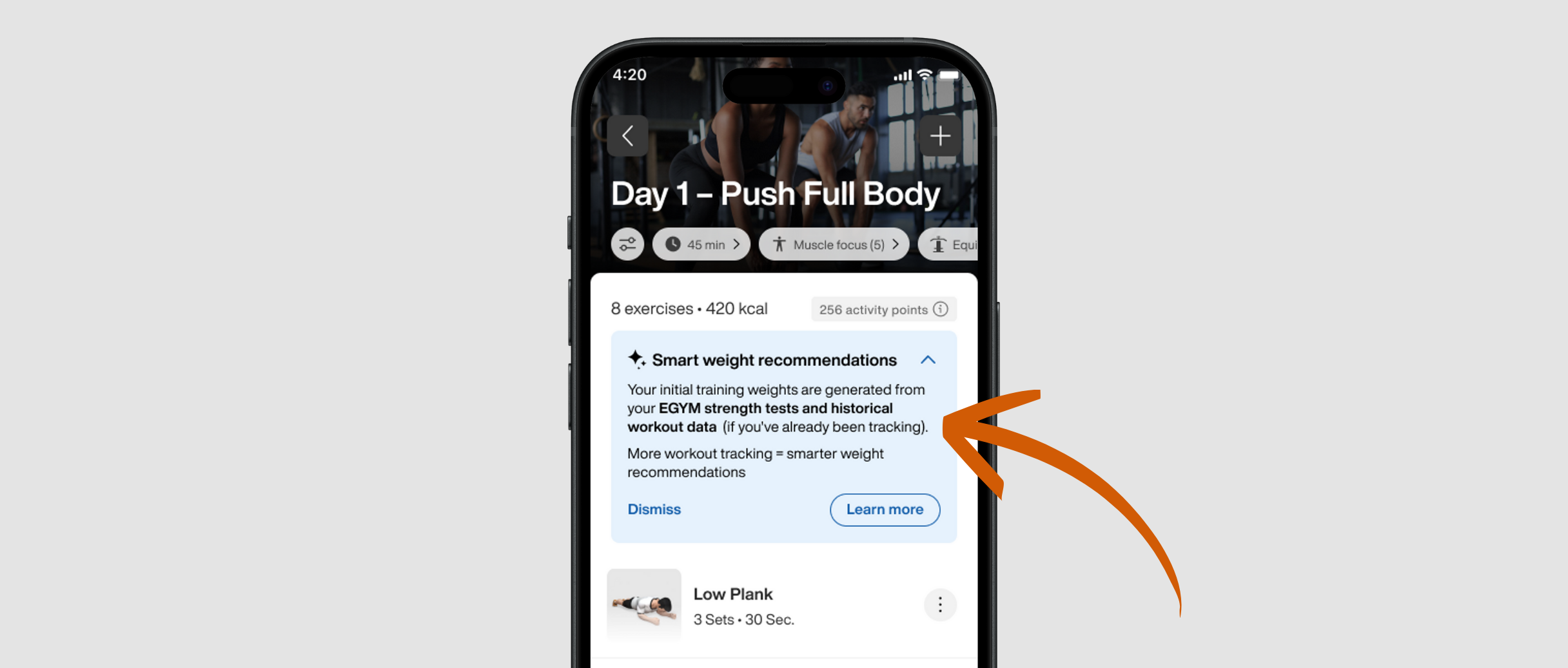 When a member begins a Genius plan without much workout history, Genius uses available data, like EGYM Smart Strength tests or previously tracked workouts, to estimate a starting weight. It’s a smart approximation based on limited data, but not yet fully personalised. As more workouts are tracked, Genius continuously fine-tunes the recommendations to better match the member’s actual fitness level.